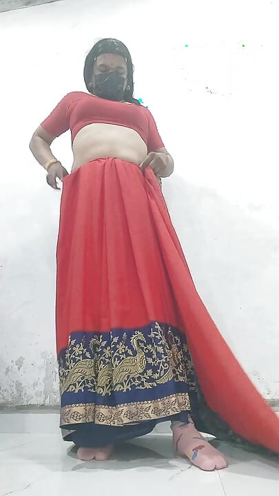 The lonely boy wore a mother's saree at home and had the pleasure of having sex at home in a belly bra